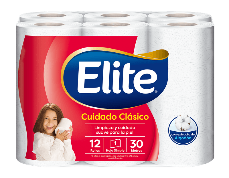 Papel Higiénico 30 metros hoja simple por bolsón de 4 paquetes de 12 rollos Elite Cuidado Clásico con extracto de algodón.